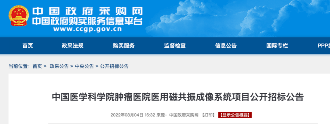 公告稱,中國醫(yī)學院腫瘤醫(yī)院預算2300萬采購醫(yī)用磁共振成像系統(tǒng),表示不接受進口產(chǎn)品。
