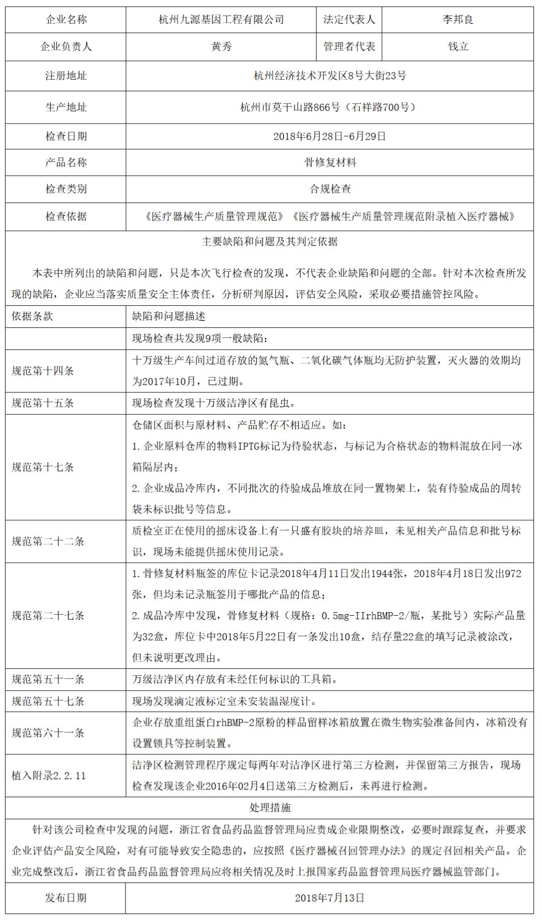 7月16日,國家藥品監(jiān)督管理局官網(wǎng)發(fā)布了最新的醫(yī)療器械生產(chǎn)企業(yè)飛檢通報。通報顯示浙江、天津、河北、山西、山東、上海共8家醫(yī)療器械公司受到了總局的飛行檢查。其中1家公司確認處于停產(chǎn)狀態(tài),7家公司發(fā)現(xiàn)一般缺陷,被要求限期整改。