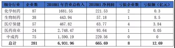 筆者統(tǒng)計(jì)的281家上市藥企業(yè)績顯示,營業(yè)總收入達(dá)到6,900多億元,凈利潤665.69億元。其中,盈利的企業(yè)273家,合計(jì)凈利潤678.38億元,虧損企業(yè)8家,虧損額12.69億元。