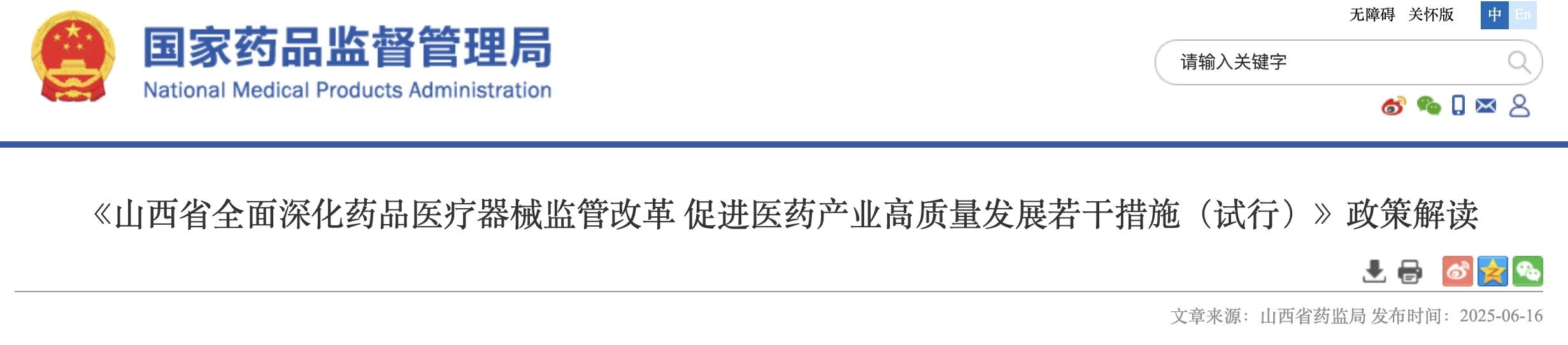 6月16日,國(guó)家藥監(jiān)局官網(wǎng)轉(zhuǎn)發(fā)《山西省全面深化藥品醫(yī)療器械監(jiān)管改革 促進(jìn)醫(yī)藥產(chǎn)業(yè)高質(zhì)量發(fā)展若干措施(試行)》政策解讀。