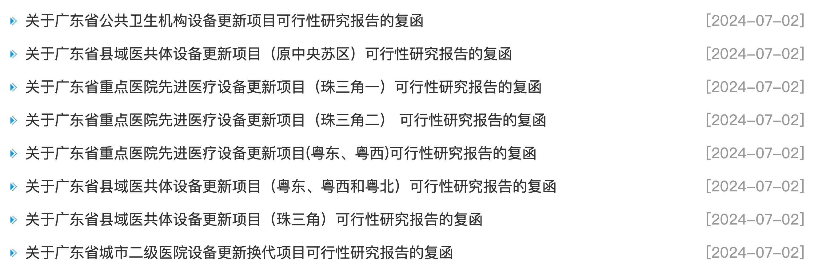 近日,廣東發(fā)改委公布多個衛(wèi)生領域設備更新項目可行性研究報告的復函,總預算約54億元。