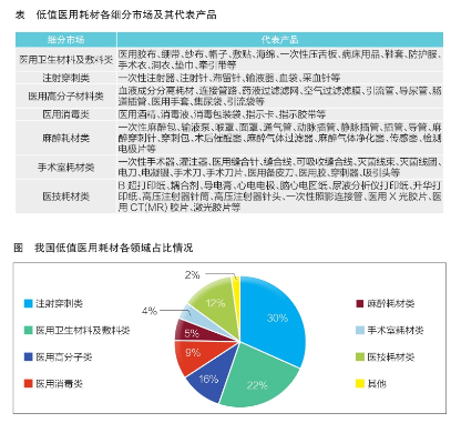 低值醫(yī)用耗材主要是指醫(yī)療機構(gòu)在開展醫(yī)療服務(wù)過程中經(jīng)常使用的一次性衛(wèi)生材料(如紗布、棉簽、手套、注射器等),可以細分為醫(yī)用衛(wèi)生材料及敷料類、注射穿刺類、醫(yī)用高分子材料類、醫(yī)用消毒類、麻醉耗材類、手術(shù)室耗材類和醫(yī)技耗材類(低值醫(yī)用耗材細分市場及其代表產(chǎn)品見表)。