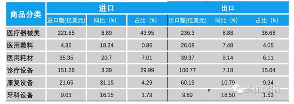 總出口額中,醫(yī)用敷料、醫(yī)用耗材、診療設備、康復設備、牙科設備出口均實現(xiàn)穩(wěn)步增長,分別提升7.48%、9.14%、7.18%、10.79%、18.50%。