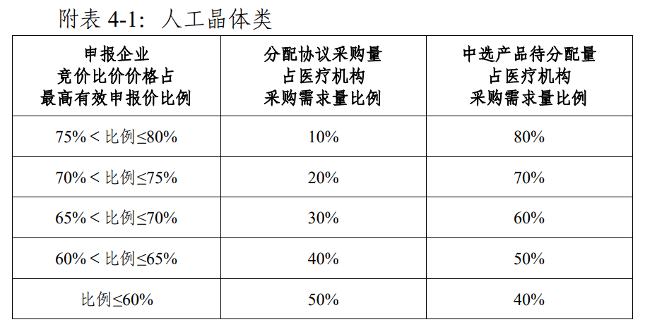 與脊柱國(guó)采類似,此次集采擬中選規(guī)則中的規(guī)則二,是行業(yè)俗稱的“躺平復(fù)活”機(jī)制。其中,人工晶體降40%、運(yùn)動(dòng)醫(yī)學(xué)降60%可獲得擬中選資格(具體折算規(guī)則、適用范圍見(jiàn)文件)。此外,第四批國(guó)采還增加了規(guī)則三:對(duì)于申報(bào)企業(yè)不超過(guò)2家的競(jìng)價(jià)單元,人工晶體降20%、運(yùn)動(dòng)醫(yī)學(xué)降30%可獲得擬中選資格。