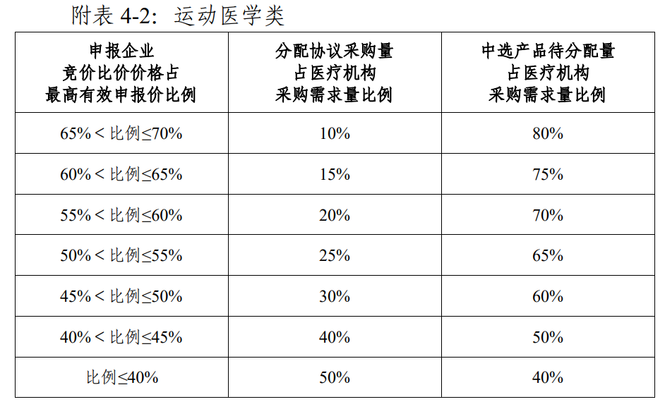 對(duì)于有效申報(bào)企業(yè)數(shù)為1家和2家的競(jìng)價(jià)單元,將根據(jù)申報(bào)企業(yè)競(jìng)價(jià)比價(jià)價(jià)格占最高有效申報(bào)價(jià)的比例,梯度分配醫(yī)療機(jī)構(gòu)協(xié)議采購(gòu)量。需要注意的是,在這一競(jìng)價(jià)單元中,所有剩余量由醫(yī)療機(jī)構(gòu)分配給中選排名首位的中選企業(yè)。
