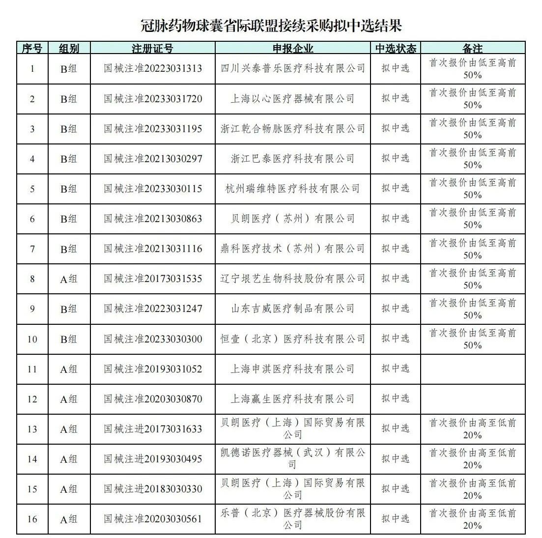 同日,江蘇醫(yī)保局還發(fā)布了《冠脈藥物球囊省際聯(lián)盟接續(xù)采購公告(四)》,冠脈藥物球囊省際聯(lián)盟此次接續(xù)采購的擬中選結果也正式出爐。