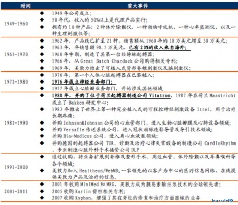 前文所述,醫(yī)療器械企業(yè)的成長歷史就是一部不斷并購的歷史。下面我們通過國外和國內(nèi)兩家最具代表性的企業(yè):美敦力和邁瑞醫(yī)療的發(fā)展過程,一探醫(yī)療器械行業(yè)的并購成長路線。