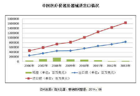 報(bào)告數(shù)據(jù)顯示,2013年我國醫(yī)療器械貿(mào)易總額達(dá)343.1億美元,同比增長14.13%,較2012年增長1個(gè)百分點(diǎn);其中,出口額為193.35億美元,同比增長9.92%,較2012年下降了2個(gè)百分點(diǎn);進(jìn)口額為149.75億美元,同比增長20.07%,較2012年增長5.5個(gè)百分點(diǎn);貿(mào)易順差43.6億美元,同比下降14.8%。