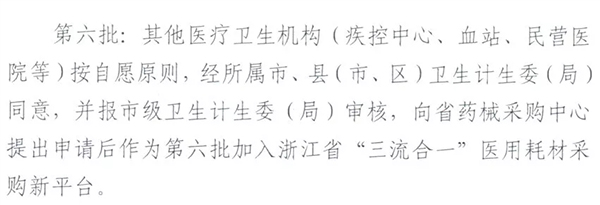 方案將浙江省的公辦醫(yī)療機(jī)構(gòu)分為六批,將自2018年4月10日至9月30日,分批全部加入省“三流合一”耗材采購新平臺。