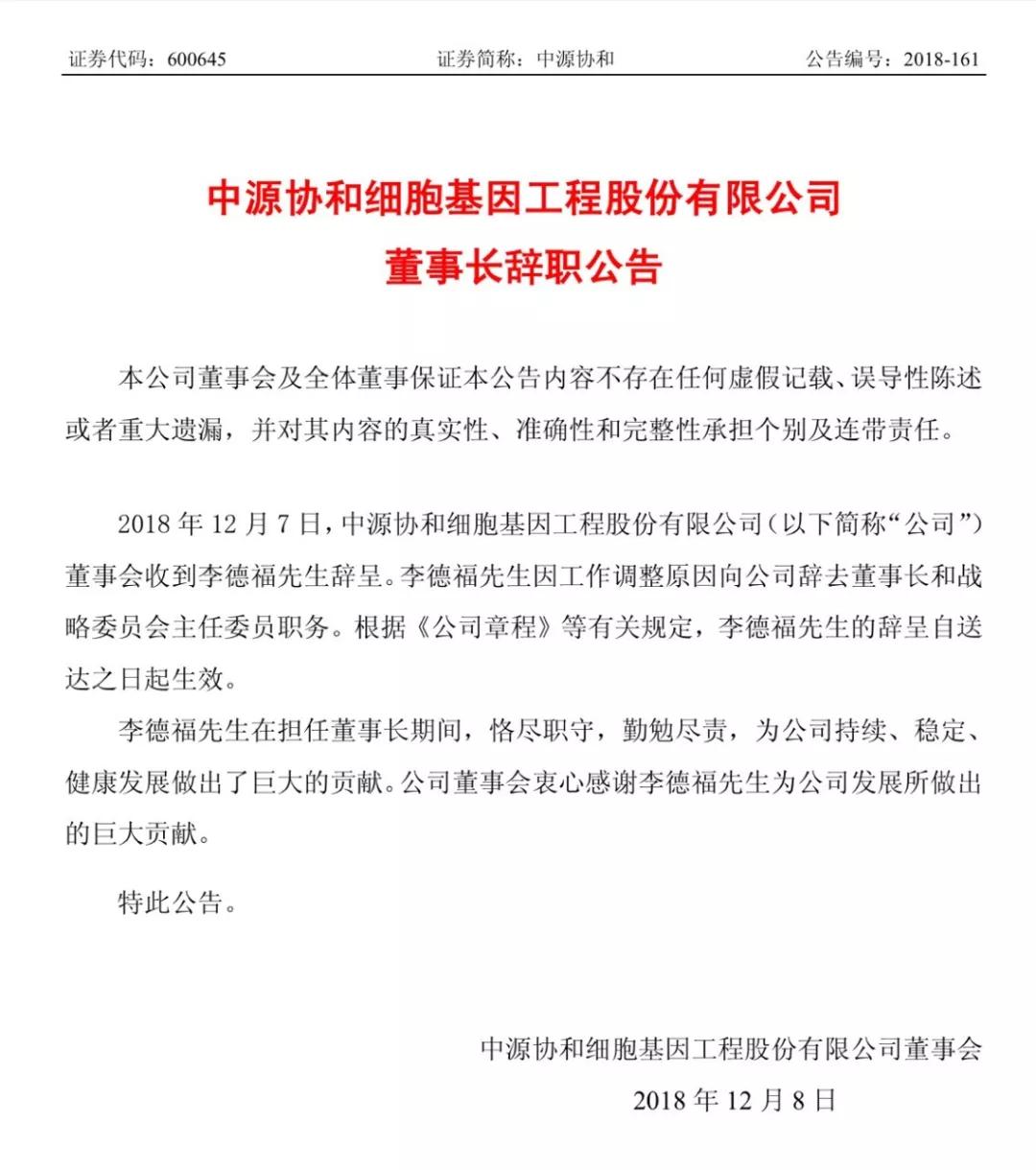 12月8日,A股上市醫(yī)療器械公司中源協(xié)和(全稱:中源協(xié)和細(xì)胞基因工程股份有限公司)發(fā)布公告稱,因工作調(diào)整原因,公司董事會(huì)收到李德福先生辭呈,其向公司辭去董事長(zhǎng)和戰(zhàn)略委員會(huì)主任委員職務(wù)。