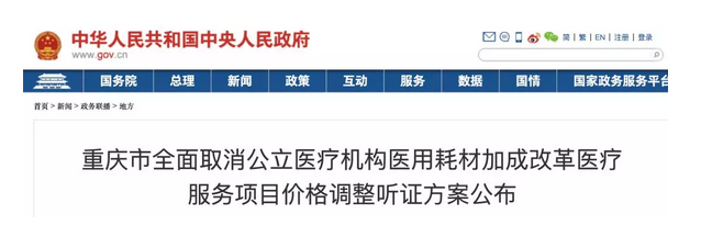 11月9日,據(jù)國務(wù)院官網(wǎng)消息,重慶市發(fā)展改革委召開新聞通氣會,發(fā)布《關(guān)于召開重慶市全面取消公立醫(yī)療機(jī)構(gòu)醫(yī)用耗材加成改革醫(yī)療服務(wù)項目價格調(diào)整聽證會的通告》。