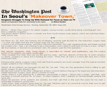 美國(guó)的權(quán)威日?qǐng)?bào)WashingtonPost(WP)在30日的報(bào)道說(shuō)期待變成像韓劇里出現(xiàn)的主人公一樣擁有大眼睛,高鼻子,小巧的臉型,打算接受整形手術(shù)的人們向首爾蜂擁而至。