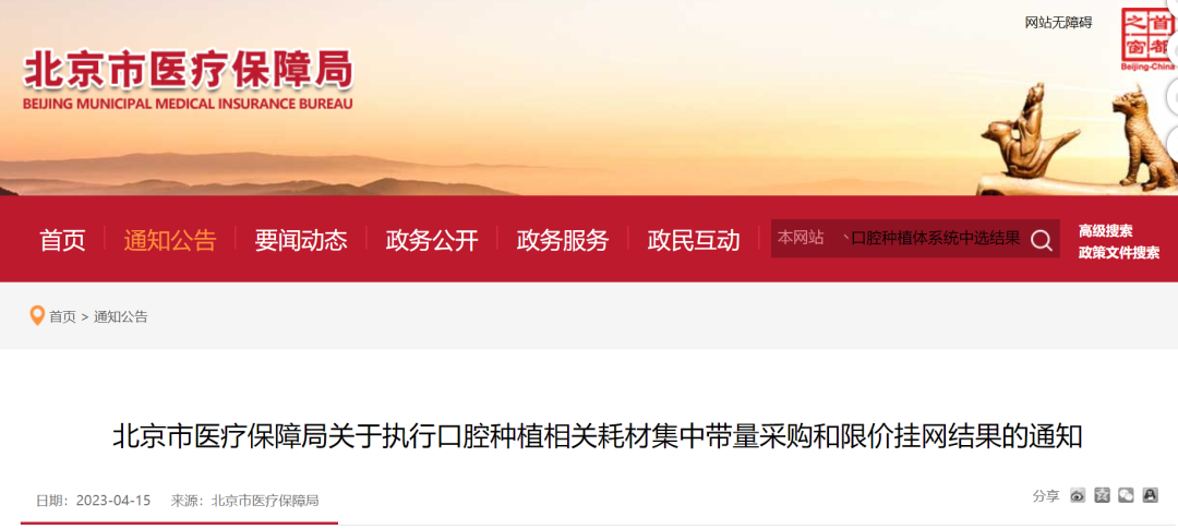 4月15日,北京市醫(yī)保局官網(wǎng)發(fā)布《北京市醫(yī)療保障局關(guān)于執(zhí)行口腔種植相關(guān)耗材集中帶量采購和限價掛網(wǎng)結(jié)果的通知》,公布了北京市口腔種植體系統(tǒng)中選結(jié)果,自4月20日,各中選企業(yè)、配送企業(yè)、醫(yī)療機構(gòu)簽訂三方協(xié)議,執(zhí)行網(wǎng)上采購。
