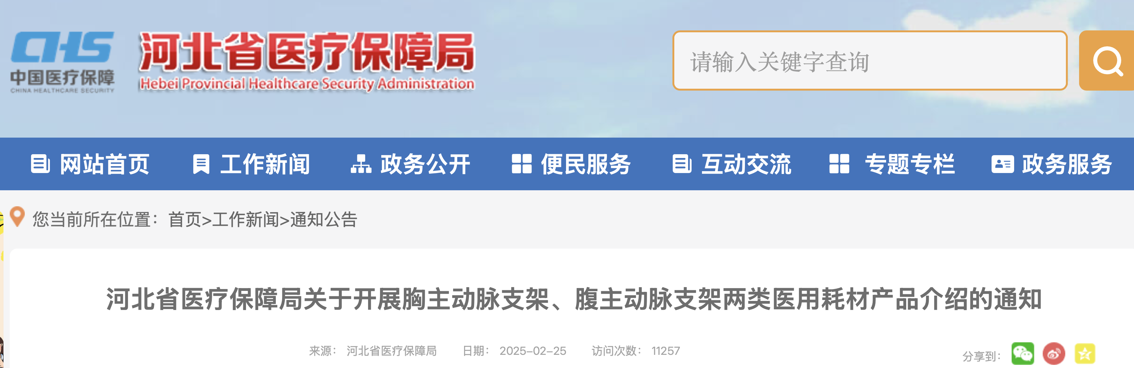 2月25日,河北醫(yī)保局發(fā)布《關(guān)于開展胸主動脈支架、腹主動脈支架兩類醫(yī)用耗材產(chǎn)品介紹的通知》(簡稱《通知》)。