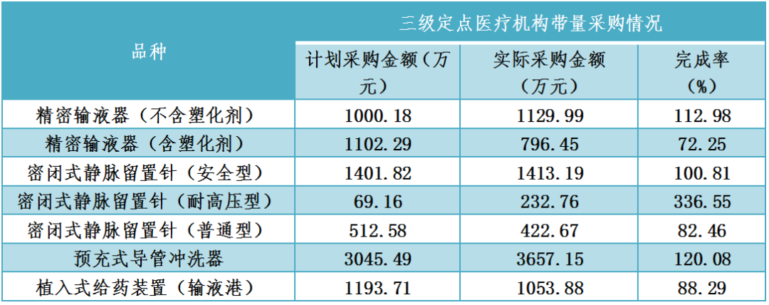 聯(lián)盟帶量采購涉及密閉式靜脈留置針(普通型、安全型、耐高壓型)、精密輸液器(不含塑化劑、含塑化劑)、植入式給藥裝置(輸液港)、預充式導管沖洗器等4類7個品種,36家定點醫(yī)療機構(gòu)實際采購進度較好,總的完成率達105.8%,超過預期。