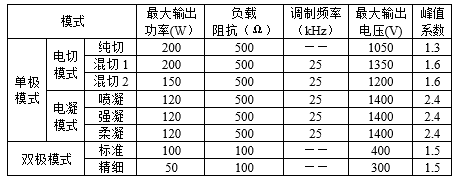 ●本手術(shù)設(shè)備的單極模式包含單極電切和單極電凝模式,其中電切模式包含純切、混切1、混切2輸出功率均可調(diào)。