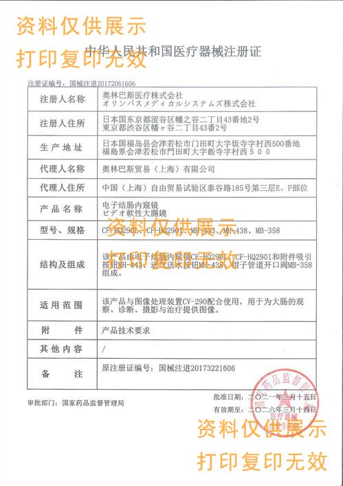 該產(chǎn)品由電子結(jié)腸鏡(CF-H190L和CF-H190I)和附件組成,附件包含吸引按鈕(MH-443)、送氣送水按鈕(MH-438)、鉗子管道開(kāi)口閥(MB-358)。性能參數(shù):分辨率≥3.51Lp/mm。照度:在工作距離處,照度應(yīng)不小于8000lx。視場(chǎng)角:170°±15%景深:2mm~100mm。送水量:送水量不得小于45ml/min。吸引量:吸引量不小于400ml/min。送氣量:送氣量≥800ml/min。彎曲角:彎曲角:上:180°;下:180°;右:160°;左:160°(允差:±10%)。